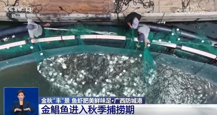 在防城港白龙珍珠湾,海面上分布着大大小小的圆形围栏,这些围栏下面就是标准化养殖金鲳鱼的深海抗风浪网箱。捕捞时,渔业工人们将网箱中的渔网收紧,成群的金鲳鱼便浮出水面,工人们再用网兜将金鲳鱼转移到运输船上。