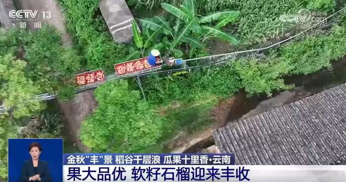 在丽江市永胜县的石榴园里,种植户正忙着用“小火车”运送石榴。采果运输、线上接单、接待采购商,忙得不亦乐乎。
