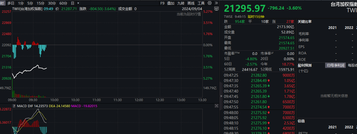 中国台湾地区股市跌势惨烈,台湾加权指数盘中跌幅一度超过5%。