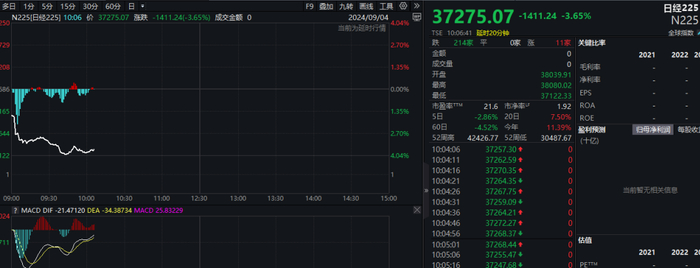日本股市今天开盘后大幅下挫,其中日经225指数跌势十分凶猛,截至发稿,盘中跌幅一度超过4%,创出今年8月6日日本股市反弹以来最大盘中跌幅,也是近一个月来最大盘中跌幅,日经225指数出现向下的跳空缺口。