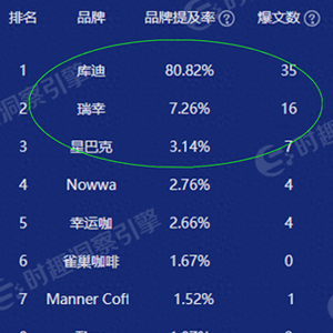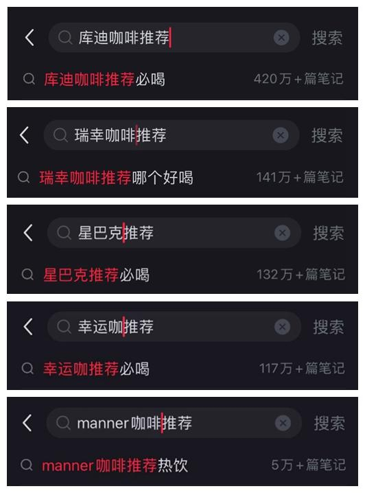 在各大社交平台,关于咖啡的话题上,总离不开“果咖”的测评和推荐帖,喝果咖成为全新的“刚需”。在热门的社交分享与种草平台小红书上面,以“XX咖啡品牌+推荐”为关键词进行检索,“库迪咖啡推荐必喝”的相关笔记分享数量超过420万篇,可谓一骑绝尘。