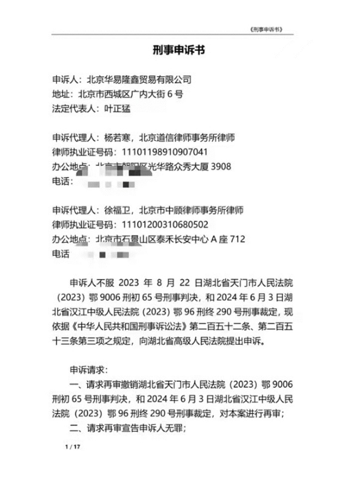 2024年6月11日,华易隆鑫签收二审刑事裁定书,判决生效。同日,天门法院对刑事判决执行立案。