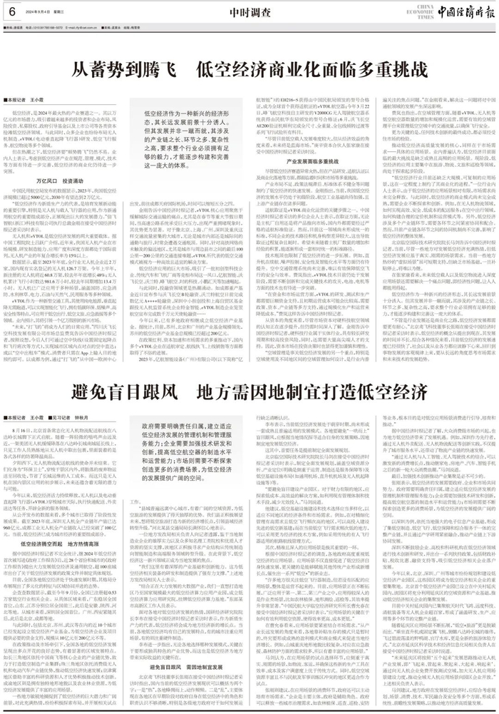 2024年,低空经济作为战略性新兴产业的代表,正以惊人的速度蓬勃发展。作为培育新质生产力的重要领域和新兴赛道,“乘风而起”的低空经济在释放市场潜力的同时,也为我国交通运输版图绘制了更加辽阔的蓝图。但低空经济在高速发展的背后,也存在着基础设施不完善、协同管理不到位、安全监管待提升等诸多问题。如何让低空经济行稳致远?低空经济商业化的路径如何探索?地方又该如何因地制宜打造低空经济?带着这些问题,中国经济时报记者进行了多方走访。