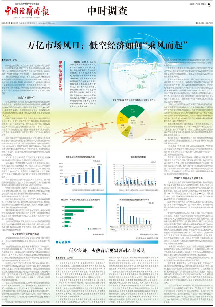 2024年,低空经济作为战略性新兴产业的代表,正以惊人的速度蓬勃发展。作为培育新质生产力的重要领域和新兴赛道,“乘风而起”的低空经济在释放市场潜力的同时,也为我国交通运输版图绘制了更加辽阔的蓝图。但低空经济在高速发展的背后,也存在着基础设施不完善、协同管理不到位、安全监管待提升等诸多问题。如何让低空经济行稳致远?低空经济商业化的路径如何探索?地方又该如何因地制宜打造低空经济?带着这些问题,中国经济时报记者进行了多方走访。