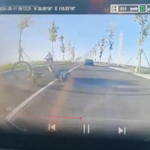 行车记录仪画面显示,8月11日上午6点12分,几名自行车骑行者从汽车左侧的车道上迎面而来。突然,骑行队伍中1人摔倒,跌到车道上并疑似被汽车碾压。另一段视频中,一个身穿骑行服的男孩趴在地上一动不动,一名男子趴在他的身上呼喊:“你坚持住……”