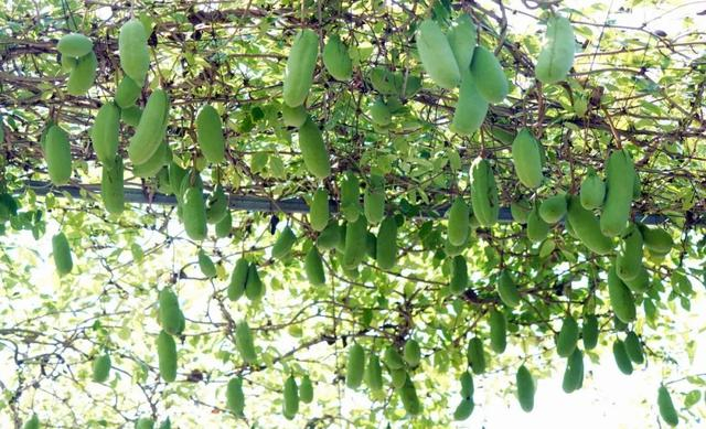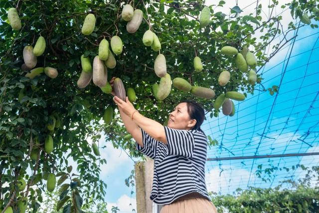 一条贯通果园的800米长廊,顶上爬满了“八月炸”,一颗颗碧绿饱满的果实悬挂在藤蔓上,一眼望过去,满是丰收的喜悦。据介绍,今年的“八月炸”长势喜人,结果量大,单果最大可达半斤,预计在中秋节成熟。生长期的“八月炸”果实呈青绿色,果皮坚硬,待到转色期外表会变成淡红色或淡紫色,成熟后会在枝头自然“炸”开,这个时候的果实是最好吃的,现摘现吃、甜嫩可口。