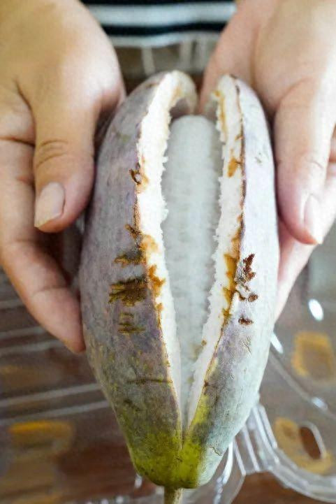 作为一种常绿木质藤本植物,“八月炸”在我国的云南、贵州、四川、江西、湖南等地区都有生长,常见于农村的山上、路边、林下等地。这种野果成熟后会自己裂开,里面的可食用部分状似香蕉,雪白的瓤包裹着黑色的籽,味道清润甘甜,是农村孩子们的天然零食。