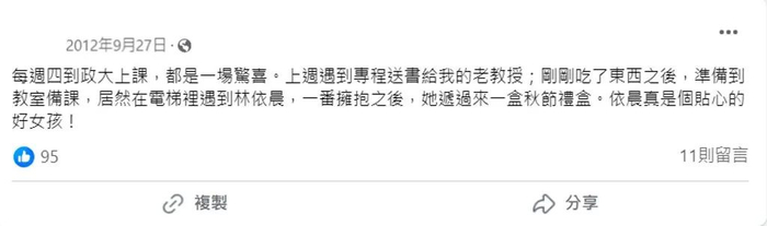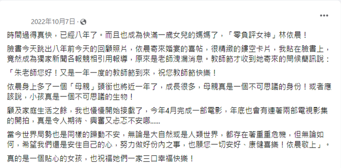 另据台媒报道,就连林依晨的大学老师,在台湾政治大学担任韩语文学系兼任讲师的朱立熙也在脸书上暗戳戳发文表示,自己在校兼课28年,“不记得教过成都人”,更叫嚣“我把她的照片全部下架,拜托教师节不要再寄来简讯,这种虚情假意太廉价。实在对‘零负评’太失望了!”