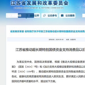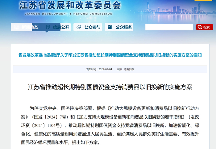 9月4日,江苏省发展改革委、财政厅联合印发《江苏省推动超长期特别国债资金支持消费品以旧换新的实施方案》。
