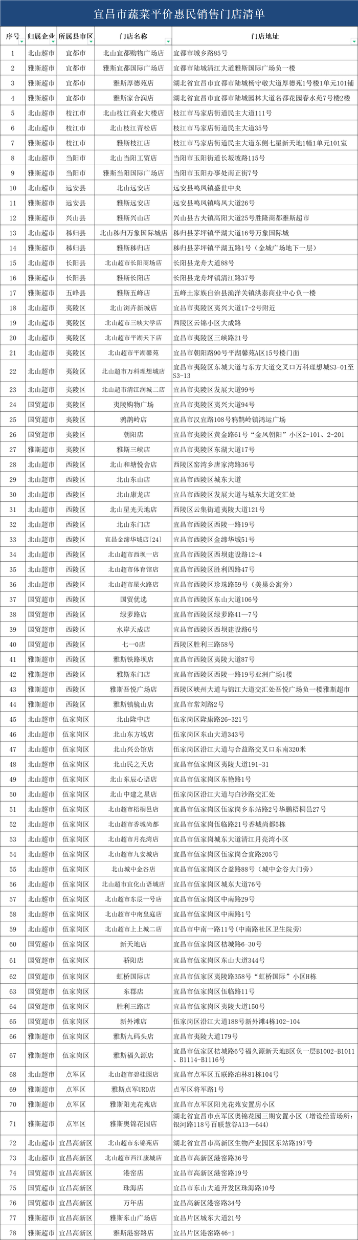宜昌北山商业连锁有限责任公司、湖北雅斯连锁商业有限公司、湖北国贸集团超市连锁有限公司3家重点保供企业在全市所辖78家门店。