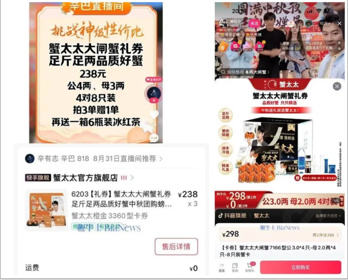 两位主播近期因带货蟹太太旗下蟹卡时在价格上发生争端。8月31日辛巴的直播间中,辛巴身旁助理称该品牌被某主播“指着鼻子去骂了”,原因是辛巴以更低价格开卖该蟹卡。辛巴称品牌方告诉他,产品被举报,已售空的大闸蟹无法继续上链接补货。