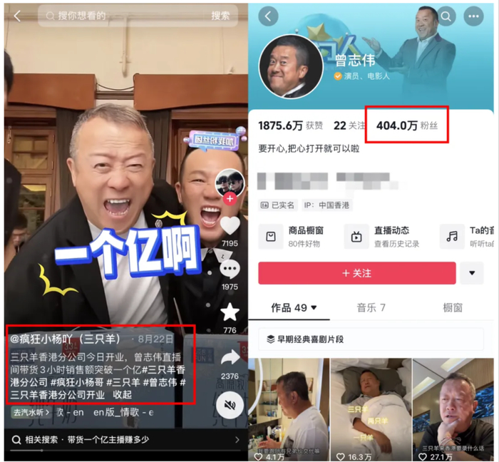 8月21日三只羊官方发布消息:三只羊控股(香港)有限公司正式开业,并宣布明星曾志伟为该公司的老板。据悉,香港公司开业时,包括谭咏麟、王晶、钟镇涛、陈浩民等一众TVB演员出席了开业仪式。当天曾志伟在其账号开播带货,3小时便创下1个亿的销售记录。目前,曾志伟的抖音账号上粉丝已达到404万。