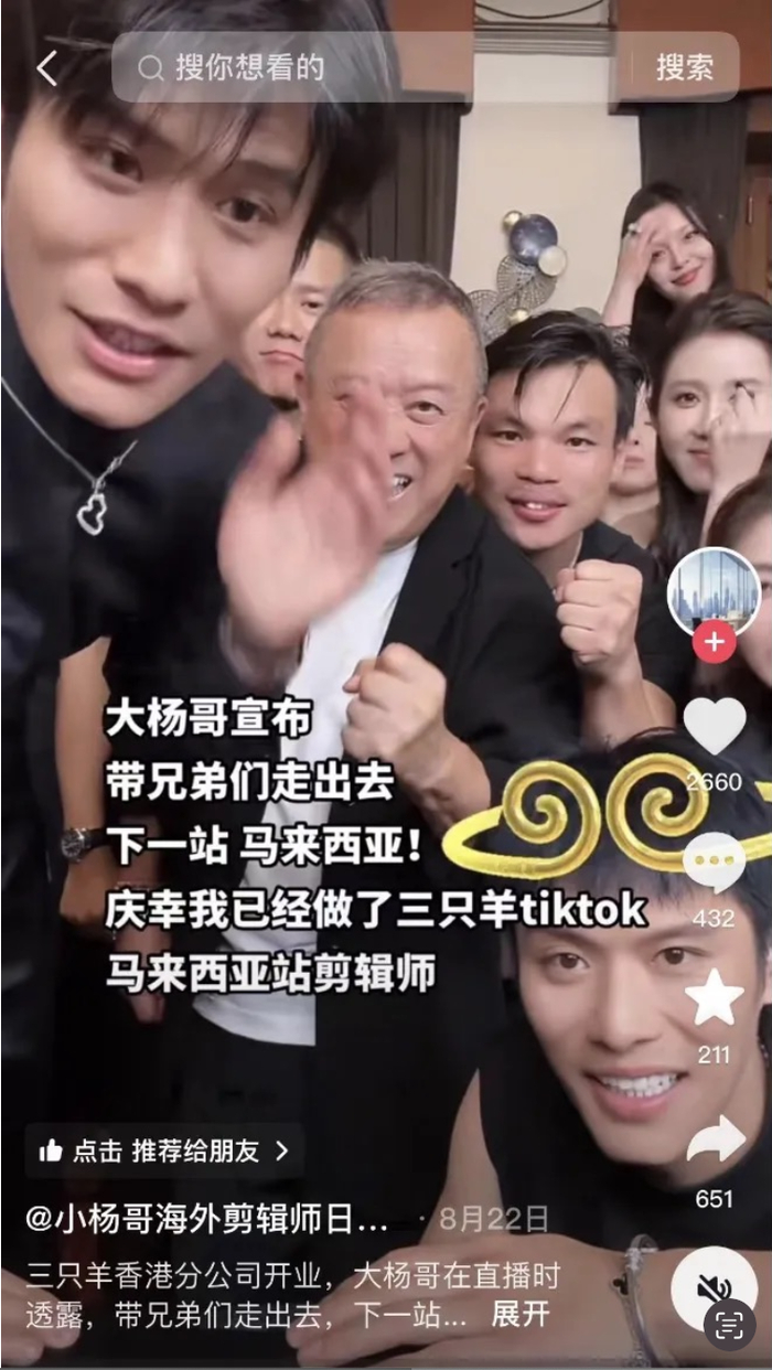 值得注意的是,香港公司开业直播时,大杨哥还在直播中透露,要带兄弟们走出去,下一站马来西亚,还号称做了三只羊tiktok。