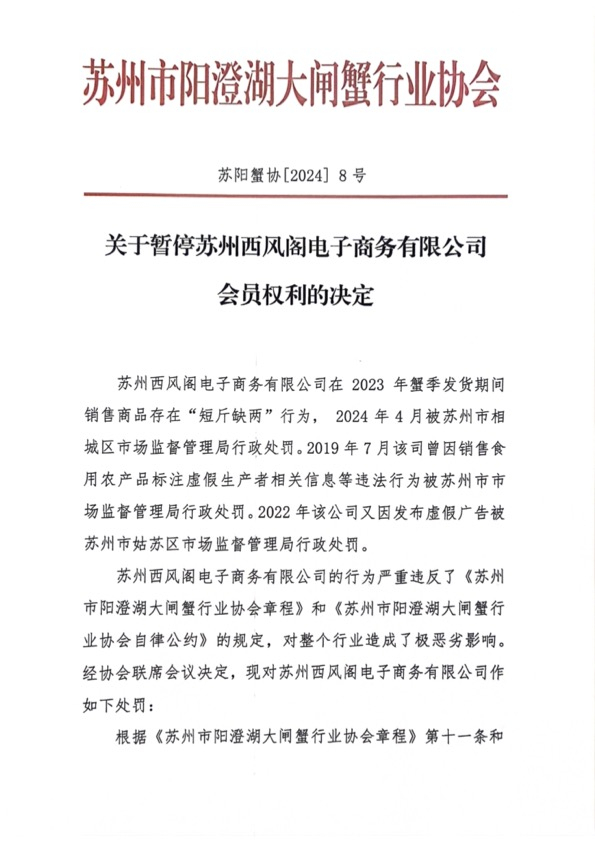 2024年6月,苏州阳澄湖大闸蟹行业协会公告:暂停该公司2024年度会员权利,退还该公司2024年已缴会费。
