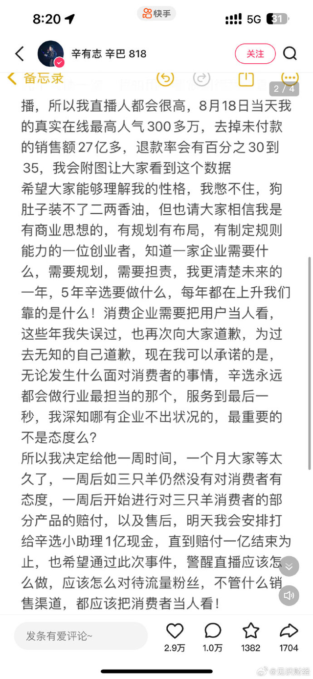 “互撕”升级!辛巴发声:安排1亿元,赔付三只羊消费者,今年不再卖大闸蟹!
