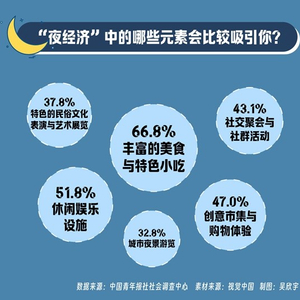 上周,中国青年报社社会调查中心联合问卷网(wenjuan.com),对1333名青年进行的一项调查显示,87.1%的受访青年身边有年轻人聚集的夜市街区,66.8%的受访青年觉得丰富的美食与特色小吃是最吸引自己的夜经济元素,54.8%的受访青年觉得年轻人喜欢进行夜间消费是为了放松解压。