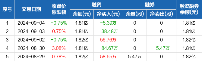 融资方面,当日融资买入159.07万元,融资偿还164.46万元,融资净偿还5.39万元。融券方面,融券卖出0股,融券偿还0股,融券余量0股,融券余额0元。融资融券余额合计1.81亿元。