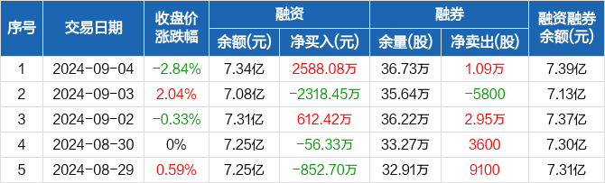 融资方面,当日融资买入3553.67万元,融资偿还965.59万元,融资净买入2588.08万元。融券方面,融券卖出1.6万股,融券偿还5100股,融券余量36.73万股,融券余额552.79万元。融资融券余额合计7.39亿元。