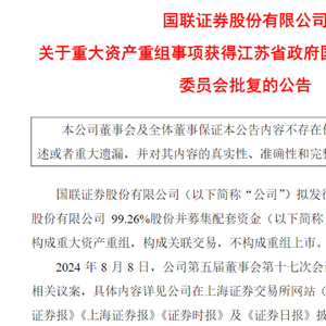 据公告,9月3日,国联证券拟收购民生证券99.26%股份并募集配套资金的相关事项,已收到江苏省政府国有资产监督管理委员会的批复,其原则同意国联证券此次资产重组和配套融资的方案。