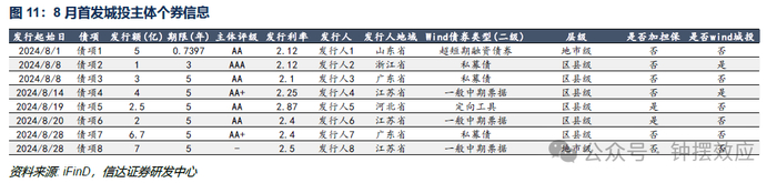 在8月交易所新增融资主体中,仍有11家主体尚在Wind城投名单上,其中交通基建主体4家,园区运营主体3家,国资运营主体2家,基础建设主体2家,其中城建类主体发行交易所产品能够新增融资主要或系前述两家城建类主体所发行的是特殊专项品种债券所致。