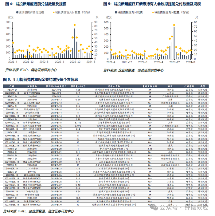 8月城投债实际提前兑付规模较上月环比上升3亿至87亿元,公告提前兑付和现金要约规模环比均有所上升。8月共17只债券提前兑付,累计兑付金额87亿元,较上月增加3亿元。而根据企业预警通数据披露,8月另有19只城投发布债券持有人会议公告拟提前兑付,拟兑付金额74.22亿元,较上月抬升16.79亿元。此外,8月有4只城投发布持有人会议公告拟现金要约购回债券,拟购回规模31亿元,现金要约购回规模较上月增加21亿元。