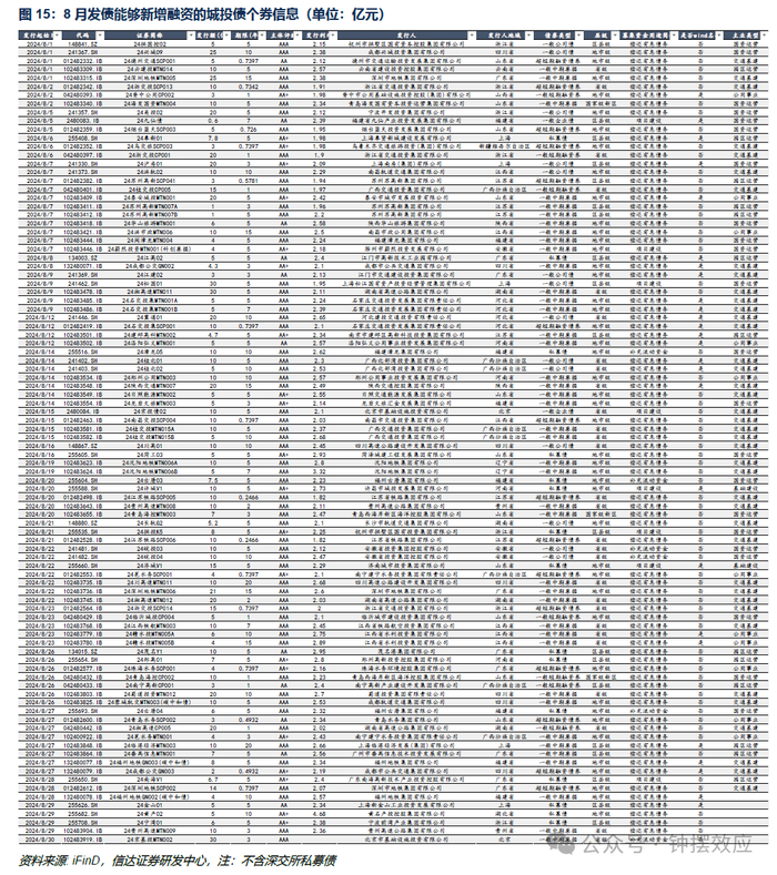 在新增融资主体中,8月协会产品发行63只,发行规模590亿元,其中偿还有息债务61只,补流1只,项目建设1只,发行规模分别为556亿元、30亿元和4亿元。偿还有息债务主体中,国资运营主体8只,交通基建主体34只,公用事业主体11只,园区运营主体8只。补流和项目建设主体中,交通基建主体1只,国资运营主体1只。