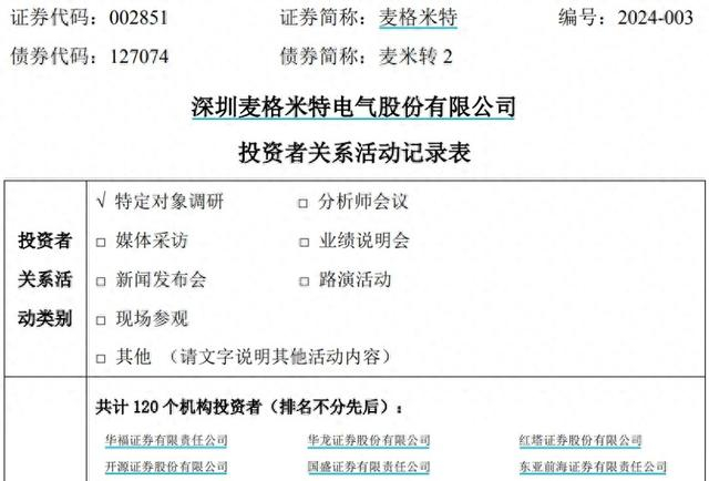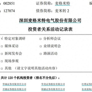 【环球网财经综合报道】9月4日,上市公司麦格米特(002851.SZ)发布了《投资者关系活动记录表》,接待了华福证券、华龙证券、红塔证券等120家投资机构代表调研,公司董事长兼总经理、首席财务官兼董事会秘书出席并解答了部分投资机构代表提问。