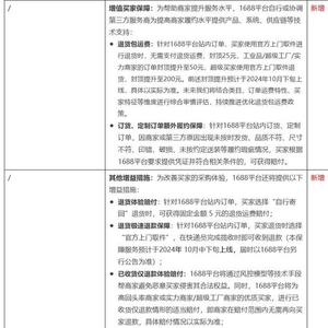 三言科技 9月5日消息,9月4日,1688发布《1688买家保障服务升级公告》,在原有基础上,新增退货包运费、退货极速退款、订货和定制订单额外履约保障等保障内容。