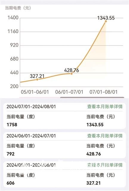 “我家6月用电量347度,7月电量直接翻倍,高达778度,一个月缴了473.95元电费。8月更夸张,总共用电量达853度。”虽然提前预料到夏天电费会上涨,可收到刚“出炉”的电费账单时,市民彭晨还是“吓了一跳”。