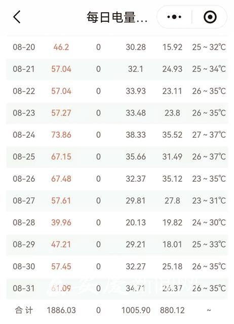 “大多时候,日用电量都在30度左右。最高一天在8月9日,那天家里来亲戚了,三台空调长时间全开,一天用了整整61.7度电。”彭晨说,7至8月正好是暑期,孩子放假在家,空调除了早晨和傍晚有片刻“休息”,其他时间段都在运转工作,这高额电费缴得“不冤”。
