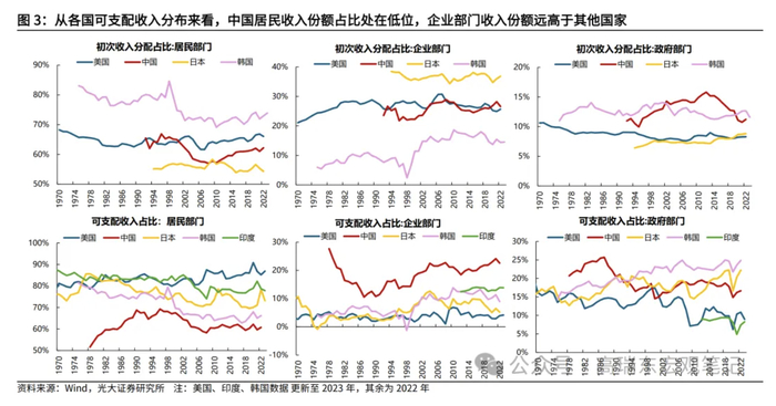 从各部门可支配收入分布来看,我国居民部门收入份额偏低,企业部门收入份额明显偏高。2022年,中国居民部门可支配收入占比为60.8%,低于发达国家和以印度为代表的发展中国家,2022年美国、日本、韩国分别为85.2%、72.6%、66.2%,印度达到78.7%。同期,中国企业部门可支配收入占比为22.6%,远高于上述国家,2022年美国、日本、韩国、印度分别为4.0%、5.2%、8.9%、13.9%。