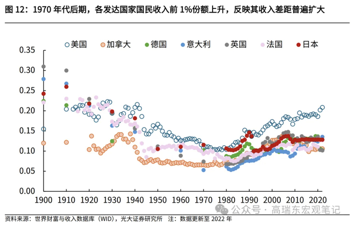 这一点和发达国家在20世纪70年代后呈现的特征相一致,均出现了劳动者内部收入差距扩大,这是由于后工业化时期,发达国家产业链调整以及技术革命的到来,推动了劳动者内部分化,拥有高技能、高人力资本的劳动者工资增长更快,而低技能劳动者受产业链外迁的影响,被迫流入低附加值的服务业,工资水平增长偏慢;另一方面,资本金融化使得高收入群体收入和财富积累更快,加剧不平等性。