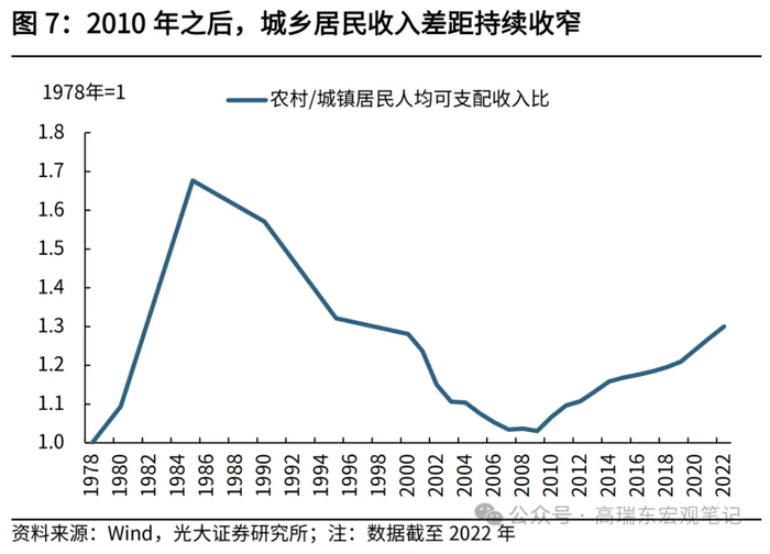 从收入差距来看,2008年之后我国基尼系数持续回落,显示收入差距持续缩小,但在2015年之后出现边际回升。2022年,我国基尼系数为0.467,仍然高于0.4的警戒线,表明当前收入差距依然较大。