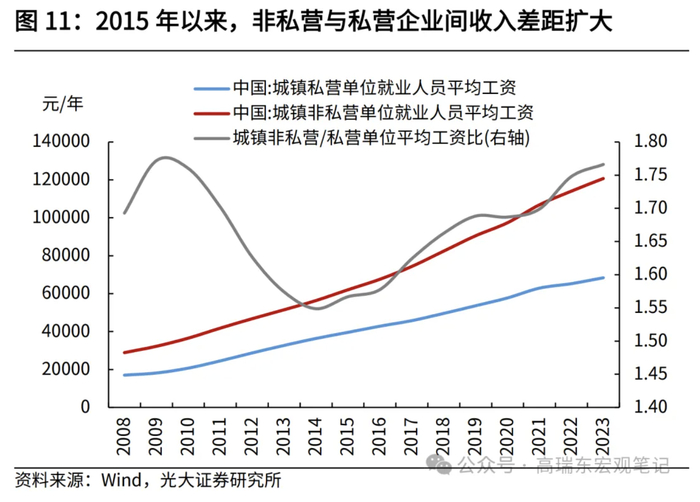 此外,从经营主体来看,近年来民营企业在收入分配领域也处于不利局面。2015年之后,中国城镇非私营单位相较私营单位的平均工资比值持续扩大,2023年比值升至1.77,高于2014年低点1.55。在我国,私营企业数量众多,提供了过半的就业岗位。根据全国第四次经济普查数据,2018年,我国工业企业中,私营企业从业人员占比为52%,在批发零售、住宿餐饮、信息技术、科学研究等服务业领域,私营企业从业人员占比分别为69%、57%、50%、52%。