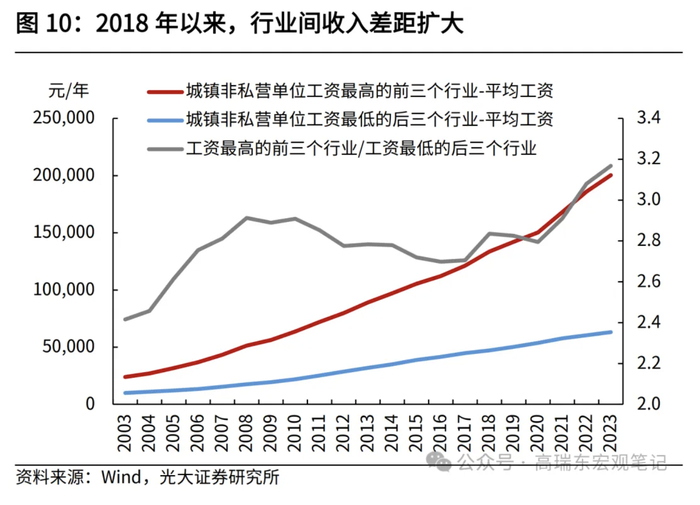 行业收入差距方面,近年来有所扩大。从城镇非私营单位就业人员平均工资来看,工资最高的前三个行业相较工资最低的后三个行业的平均工资比值扩大,自2016年的低点持续升至2023年的3.17。其中,2023年工资最高的三个行业为信息传输、软件和信息技术服务业,金融业,科学研究和技术服务业;工资最低的三个行业为住宿和餐饮业,农林牧渔业,水利、环境和公共设施管理业。行业收入差距扩大,可能与近年来技术进步、产业结构调整、资本金融化有关,使得高技能的劳动者工资水平增长更快。例如,2018-2023年间,城镇非私营单位中,信息传输、软件和信息技术服务业就业人员平均工资年复合增速为9.4%,高于整体工资增速7.9%,明显高于住宿餐饮行业就业人员工资增速3.8%。