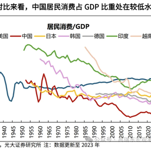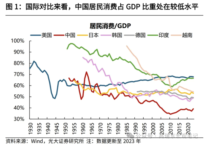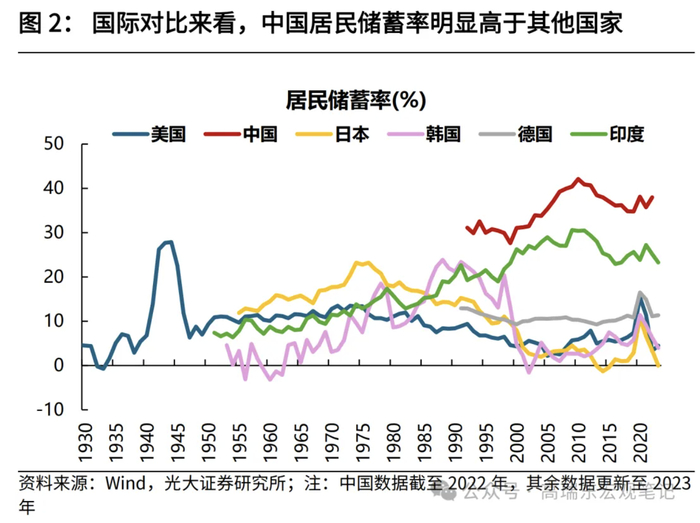 消费不足是我国经济长期面临的问题,其底层逻辑源于收入分配不均,表现为居民部门收入份额偏低,收入差距扩大等因素导致储蓄率偏高。2023年中国居民消费/GDP比重仅为39%,不仅远低于同期发达国家水平,也弱于部分发展中国家。从世界银行统计的人均GDP来看,2023年中国人均GDP为12614美元,相当于1980年的美国,1985年的日本,1995年的韩国,当时美日韩对应的居民消费/GDP比重均处在50%-60%,远高于目前的国内水平。从储蓄率来看,2022年中国居民储蓄率为38%,而日本在1985年、韩国在1995年的居民储蓄率均在16%左右,即便与储蓄倾向较高的日韩等东亚国家相比,中国居民储蓄率依然偏高。