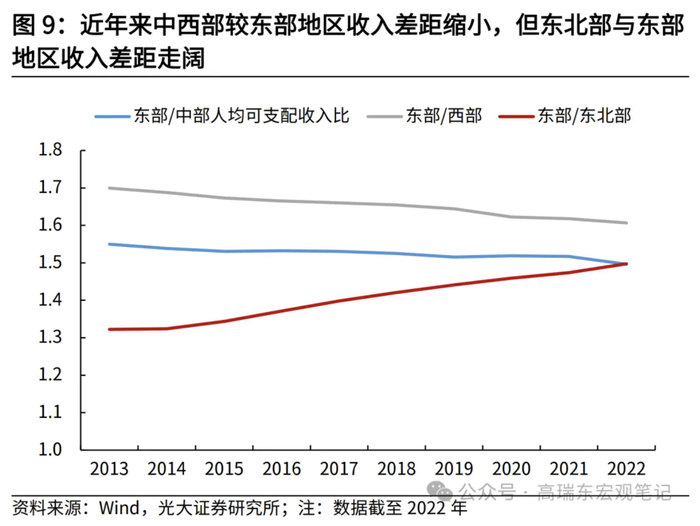 区域收入差距方面,东部与西部、中部地区收入差距缩小,但东部与东北部地区收入差距持续扩大。2022年,东部与中部、西部地区居民可支配收入比值分别为1.50、1.61,均低于2013年的1.55、1.70,显示居民收入相对差距在缩小。而2022年,东部与东北部地区居民可支配收入比值为1.50,高于2013年的1.32,显示收入差距的走阔。