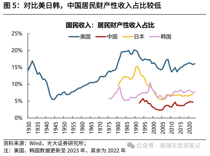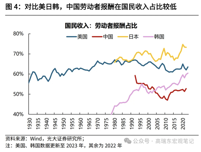 对比日本,其依靠直接税和社会保障体系两大工具,在再分配环节中,大幅提高居民部门收入份额,缩小收入差距。初次分配环节中,2022年,日本居民、企业、政府部门收入份额分别为54%、37%、9%,经过再分配环节调整后,居民、企业、政府部门收入份额分别为73%、5%、22%,表现为企业部门收入向居民和政府部门大幅转移。