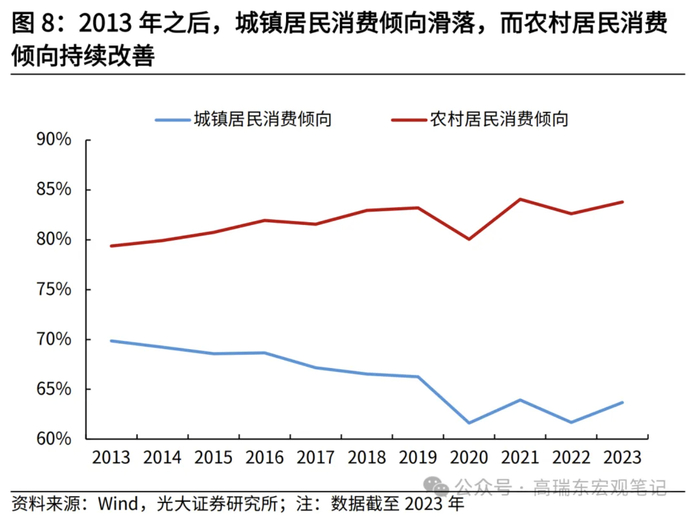 城乡收入差距方面,2010年之后,农村居民收入增长持续快于城镇居民,相对差距持续缩小。2023年,农村居民人均可支配收入为21691元,城镇居民人均可支配收入为51821元,城乡居民收入比值缩小至2.39,低于2013年的2.81。从城乡居民消费倾向来看,2013年之后城镇居民消费倾向呈下降趋势,一方面与房价高企挤压消费、城镇居民收入增速放缓等因素有关,另一方面可能也反映出内部收入差距扩大的情况,由于富裕人群的边际消费倾向更低,贫富分化加剧意味着整体消费倾向的降低。而同期农村居民消费倾向持续改善,表明随着城乡居民收入差距收窄,有助于提升整体消费倾向。
