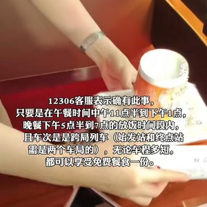 对此,12306客服表示确有此事,只要是在午餐时间中午11点半到下午1点,晚餐下午5点半到7点的放饭时间段内,且车次是是跨局列车(始发站和终点站需是两个车局的),无论车程多短,都可以享受免费餐食一份。