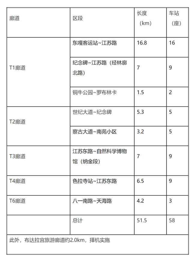根据公示内容,拉萨市低运量轨道交通建设规划拟定上报方案总规模51.5km,设站58座,设置3段1场,由规划线网中6个廊道组成。此外,布达拉宫旅游廊道约2.0km择机实施。