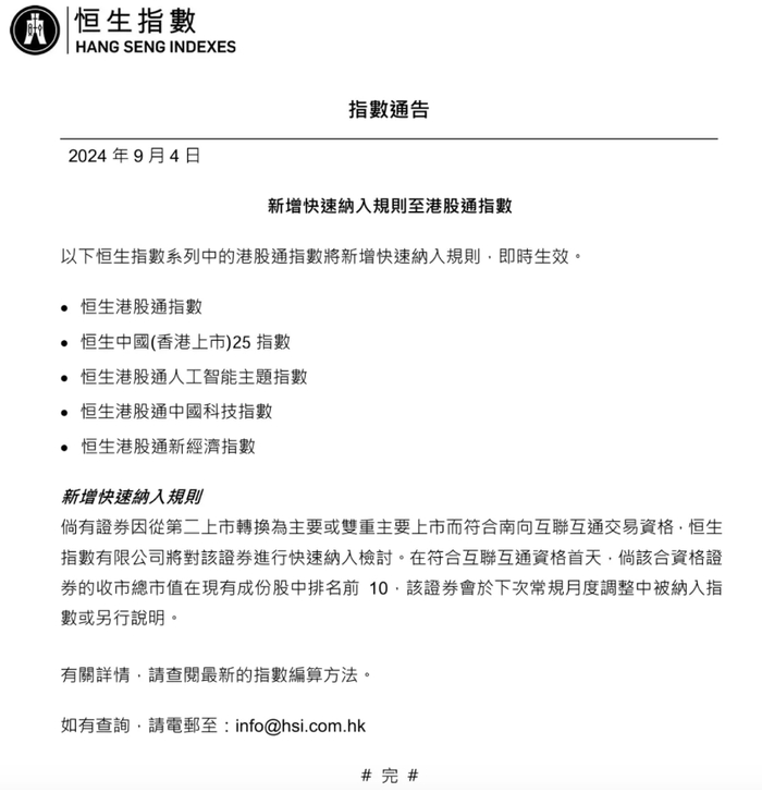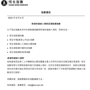 9月4日,恒生指数公司发布公告称,恒生港股通指数等多只指数将新增快速纳入规则。
