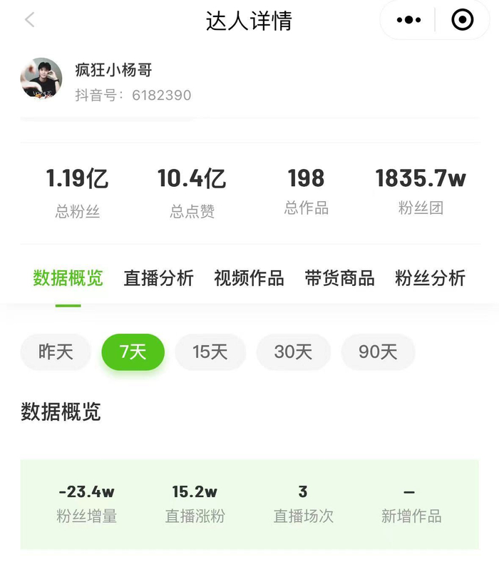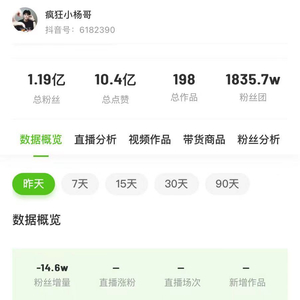 据查询第三方数据发现,“疯狂小杨哥”账号自8月31日大闸蟹事件后持续处于掉粉状态,目前已掉粉超23万,并于昨日一天掉粉超14万。
