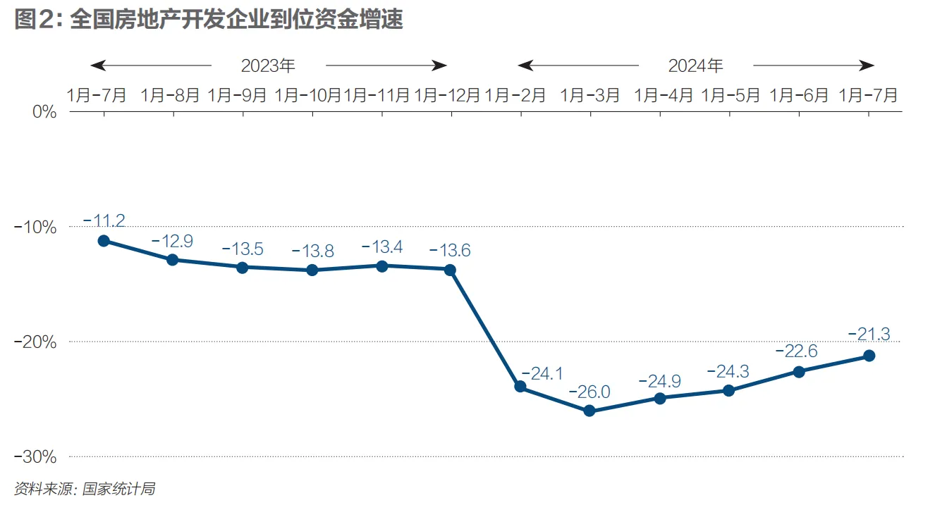 一方面,房地产开发企业到位资金降幅在收窄。2024年一季度该数据同比下滑26%后,1月-7月,该数据降幅已收窄至21.3%,相对于一季度数据收窄4.7个百分点。