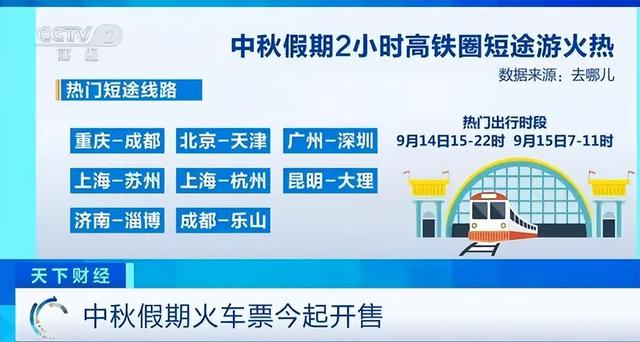 数据显示,中秋假期出游以短途游为主,江浙沪、广深、成渝2小时高铁圈旅客流动更频繁,热门短途线路有重庆-成都、北京-天津、广州-深圳、上海-苏州、上海-杭州、昆明-大理、济南-淄博、成都-乐山等,9月14日15时-22时、9月15日7时-11时是热门出行时段。根据12306预售情况来看,预计高铁客流高峰在9月15日。客流主要集中在西安、重庆、贵阳、达州、泸州、黄龙九寨等热门方向。