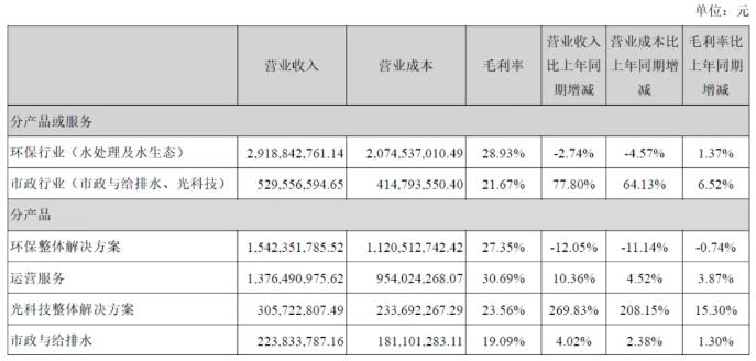上半年,面对外部环境和政策变化等多重挑战,公司持续聚焦主业,强化市场开拓,主要业务领域市场开发稳步推进,主业发展良好。反映到收入表现上,公司上半年实现营业收入34.48亿元,同比增长4.53%。其中,公司环保整体解决方案收入15.42亿元,同比下滑12.05%;运营服务收入13.76亿元,同比增长10.36%;光科技整体解决方案收入3.06亿元,同比实现208.15%的大幅增长;市政与给排水2.24亿元,同比增长4.02%。