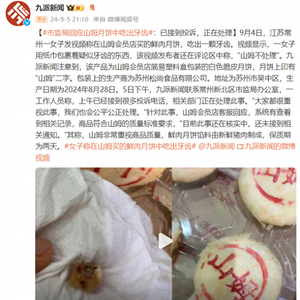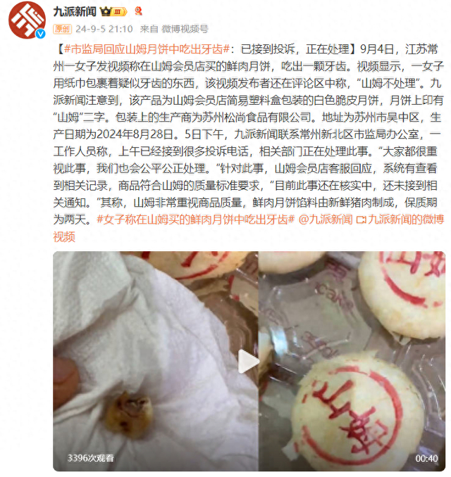 9月4日,江苏常州一女子发视频称在山姆会员店买的鲜肉月饼,吃出一颗牙齿。视频显示,一女子用纸巾包裹着疑似牙齿的东西,该视频发布者还在评论区中称,“山姆不处理”。九派新闻注意到,该产品为山姆会员店简易塑料盒包装的白色脆皮月饼,月饼上印有“山姆”二字。包装上的生产商为苏州松尚食品有限公司。地址为苏州市吴中区,生产日期为2024年8月28日。5日下午,九派新闻联系常州新北区市监局办公室,一工作人员称,上午已经接到很多投诉电话,相关部门正在处理此事。“大家都很重视此事,我们也会公平公正处理。”针对此事,山姆会员店客服回应,系统有查看到相关记录,商品符合山姆的质量标准要求,“目前此事还在核实中,还未接到相关通知。”其称,山姆非常重视商品质量,鲜肉月饼馅料由新鲜猪肉制成,保质期为两天。