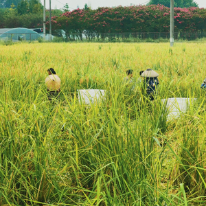 虽然播种、收割时间与普通水稻基本同步,管护方式也相同,但巨型稻的试种还是有一些“特殊”之处。几天前,鹃农农场的20余亩巨型稻完成了收割。20多名收割手顶着烈日,在比自己还高的稻田里忙碌了一整天。如果换成机收,只需2个小时就能完成。
