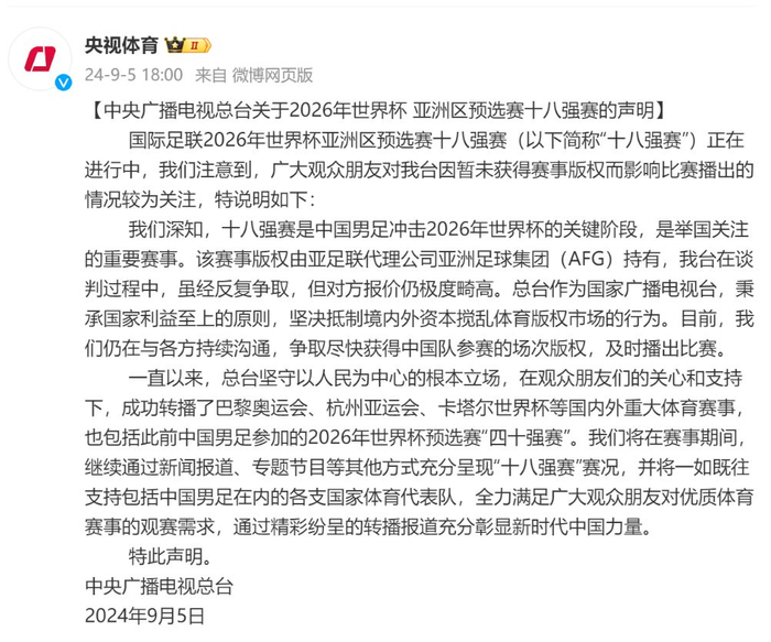 值得注意的是,9月5日18时,央视体育发布声明表示,深知十八强赛是中国男足冲击2026年世界杯的关键阶段,是举国关注的重要赛事。但由于该赛事版权方报价极度畸高,最终未能成功购买。