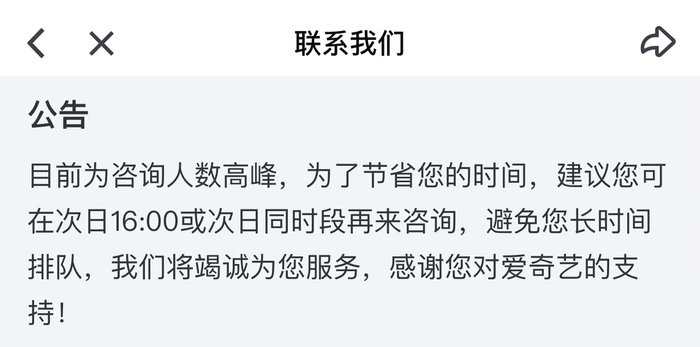 爱奇艺APP在客服页面公告:目前为咨询人数高峰,为了节省时间,建议可在次日16:00或次日同时段再来咨询,避免长时间排队。